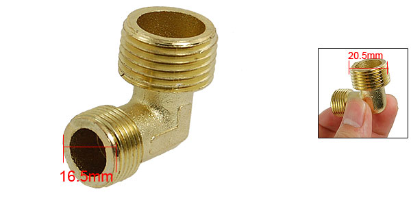 DetailsAir Compressor 16.5 x 20.5mm Brass 90 Degree Male Elbow  Product Name Male Elbow Model 2P Material Brass Color Gold Tone Thread Diameter Small: 16.5mm / 0.65" Large: 20.5mm / 0.8" Overall Size 30 x 30 x 13.5mm / 1.2" x 1.2" x 0.53"(L*W*T) Weight 26.7g Package Content 1 x Male Elbow