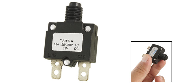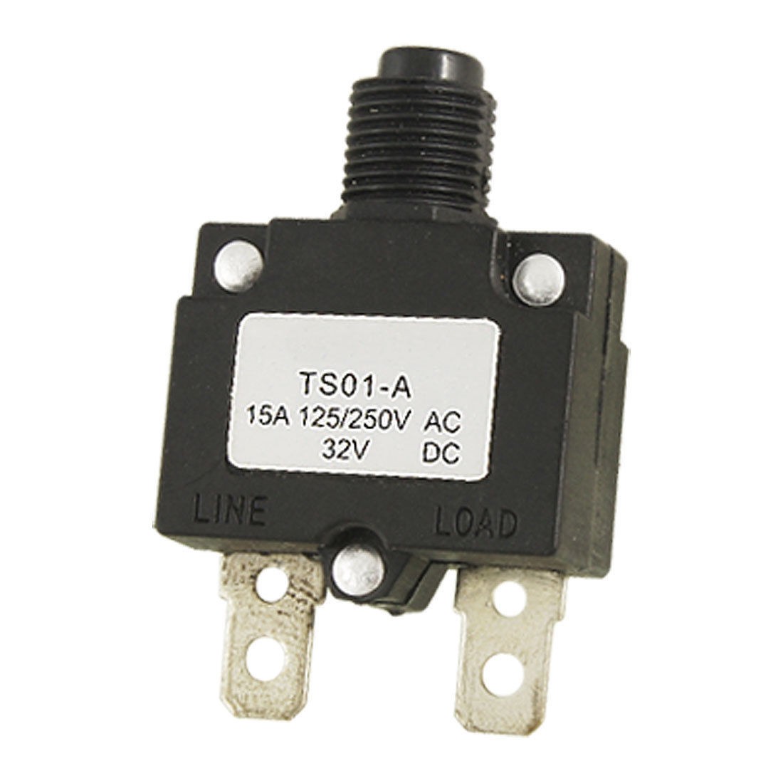 Product Name Circuit Breaker Model No. TS01-A Rated Current 15A Rated Voltage AC125/250V, DC 32V Thread Dia (Approx.) 1.04cm / 0.409" Overall Size (Approx.) 2.8 x 1.4 x 4.7cm/1.1" x 0.55" x 1.85"(L*W*H ) Material Plastic, Metal Color As Picture Shown Weight 13g Package Content 1 x Circuit Breaker - Reviews