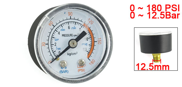 DetailsAir Compressor Fittings 12.5mm Dia Thread 12.5 Bar Pressure Gauge  Product Name Compressor Gauge Material Metal, Plastic Type Dial Type Pressure Range 0 ~ 180 PSI, 0 ~ 12.5Bar Thread Diameter 12.5mm / 0.49" Case Size (Approx) 50 x 24mm/1.97" x 0.94" (D*T) Total Size 50 x 40mm/1.97" x 1.57"(Top.Dia*T) Main Color Silver Tone Weight 54g Package Content 1 x Compressor Gauge
