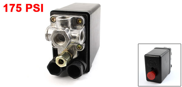 Product Name Air Compressor Pressure Switch Type 4 Ports Max. Voltage AC 240V Current 15A Pressure 175 PSI, 12 Bar Joint Thread Hole Dia.(Each) 11mm/0.4" Hole Dia.(Black) 15mm/ 0.6" Hex Head Hole (Brass Tone) 6mm/0.24" Total Size 11 x 8 x 5.1cm/4.3" x 3.1" x 2" (L*W*T) Button Diameter 20mm/ 0.78" Material Metal, Plastic Main Color Black Total Weight 320g Package Content 1 x Air Compressor Pressure Switch - Reviews