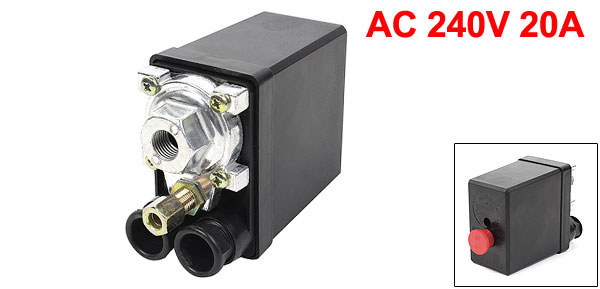 Product Name Air Compressor Pressure Switch Type 1 Port, 1 Phase, Normally Closed(NC) Max. Voltage AC 240V Max. Current 20A Pressure 175 PSI / 12 Bar Joint Thread Hole Dia.(Each) 3/8" (NPT) Inlet Hole Dia 6mm/ 0.2" Inlet Thread Dia. 11mm/ 0.4" Total Size 11 x 7.7 x 4.6cm/ 4.3" x 2.9" x 1.7" (L*W*T) Button Diameter 2cm/ 0.8" Material Metal, Plastic Main Color Black, Red Weight 291g Package Content 1 x Air Compressor Pressure Switch - Reviews