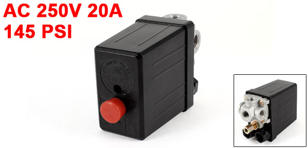 Product Name Air Compressor Pressure Switch Type 4 Ports DPST(2NC) Max. Voltage AC 250V Current 20A Pressure 145 PSI, 10 Bar Joint Thread Hole Dia.(Each) 1/4PT Inlet Hole Dia 5.5mm/0.22" Inlet Thread Dia 12mm/0.47" Hole Dia.(Black) 13mm/ 0.51" Hex Head Hole (Brass Tone) 6mm/0.24" Total Size 13 x 8 x 5cm/5.1" x 3.1" x 2" (L*W*T) Button Diameter 18mm/ 0.7" Material Metal, Plastic Main Color Black, Red Net Weight 317g Total Weight 346 Package Content 1 x Air Compressor Pressure Switch - Reviews