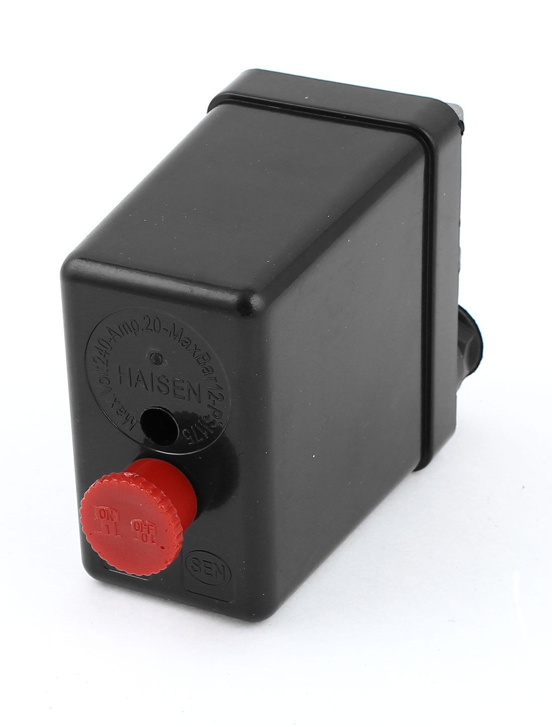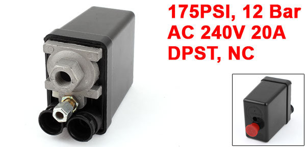 Product Name Air Compressor Pressure Switch Type 1 Ports, 1 Phase, DPST, NC Max. Voltage AC 240V Max. Current 20A Pressure 175PSI, 12 Bar Joint Thread Diameter 12mm/1/4PT Bronze Tone Connector 9mm/0.35" Black Connector Inner Dia. 17mm/0.67" Total Size 12.8 x 8.1 x 5.2cm/ 5" x 3.2" x 2" (L*W*T) Button Diameter 2.1cm/ 0.8" Material Metal, Plastic Main Color Black, Red Weight 283g Package Content 1 x Air Compressor Pressure Switch - Reviews