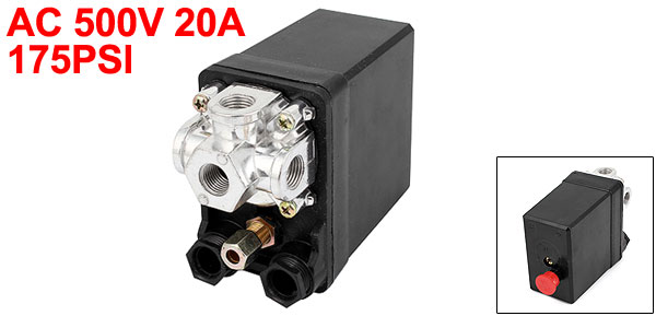 Product Name Air Compressor Pressure Switch Type 4 Port Max. Voltage AC 500V Max. Current 20A Pressure 175PSI, 40Bar Joint Thread Hole Dia. 11mm/1/4PT Gold Tone Thread Hole Dia 9mm/0.35" Plastic Thread Hole Dia 18mm/0.7" Total Size 13 x 9 x 5.8cm /5.1" x 3.5" x 2.3" (L*W*H) Button Diameter 2cm/ 0.8" Material Metal, Plastic Main Color Black, Red Weight 610g Package Content 1 x Air Compressor Pressure Switch - Reviews