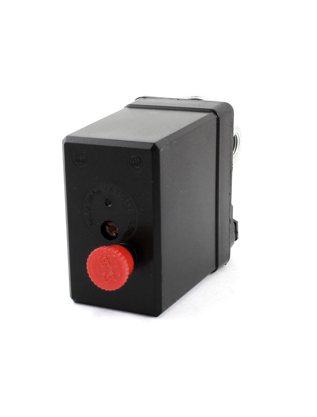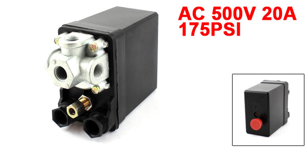 Product Name Air Compressor Pressure Switch Type 4 Port Max. Voltage AC 500V Max. Current 20A Pressure 175PSI, 40Bar Joint Thread Hole Dia. 12mm/1/4PT Gold Tone Thread Hole Dia 7mm/0.27" Plastic Thread Hole Dia 16mm/0.63" Total Size 13 x 9 x 5.8cm /5.1" x 3.5" x 2.3" (L*W*H) Button Diameter 2cm/ 0.8" Material Metal, Plastic Main Color Black, Red Weight 610g Package Content 1 x Air Compressor Pressure Switch - Reviews
