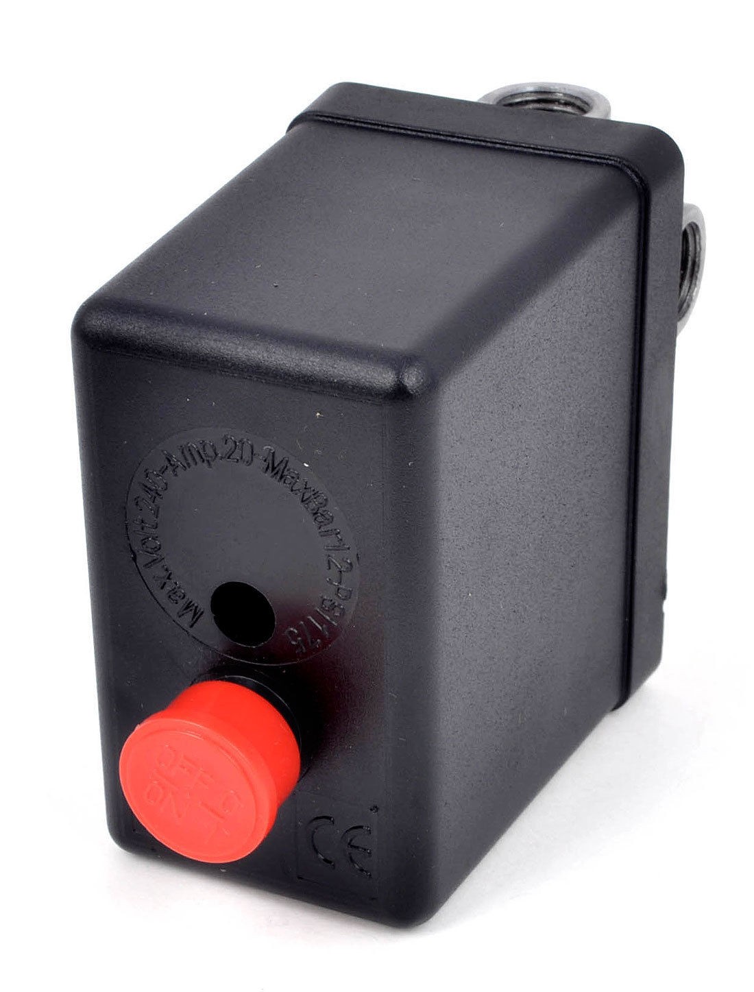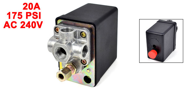 Product Name Air Compressor Pressure Switch Type 4 Ports DPST(2NC) Max. Voltage AC 240V Current 20A Pressure 175 PSI, 12 Bar Joint Thread Hole Dia.(Each) 15/32PT Inlet Hole Dia 5.5mm/0.22" Inlet Thread Dia 9.5mm/0.37" Hole Dia. 7mm/ 0.27" Hex Head Hole (Brass Tone) 6mm/0.24" Total Size 12 x 7.6 x 4.8cm/4.7" x 3" x 1.8" (L*W*T) Button Diameter 1.8cm/ 0.7" Material Metal, Plastic Main Color Black, Red,Silver Tone Weight 338g Package Content 1 x Air Compressor Pressure Switch - Reviews