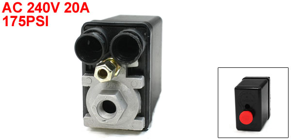 Product Name Air Compressor Pressure Switch Type 1 Ports, 1 Phase, DPST, NO Max. Voltage AC 240V Max. Current 20A Pressure 175PSI, 12 Bar Joint Thread Hole Dia.(Each) 1/4" (NPT) Total Size 12.8 x 8.1 x 5.3cm/ 5" x 3.2" x 2.1" (L*W*T) Button Diameter 2.1cm/ 0.8" Material Metal, Plastic Main Color Black, Red Weight 285g Package Content 1 x Air Compressor Pressure Switch - Reviews