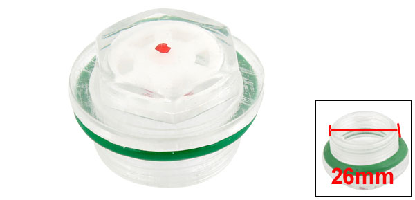 Product Name Oil Level Sight Glass Material Plastic Color Clear, Green Thread Diameter 26mm/1" Overall Size 34 x 22cm/ 1.3" x 0.83" (D*T) Net Weight 8g Package Content 1 x Oil Level Sight Glass - Reviews