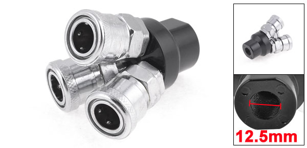 Product Name Quick Coupler Material Metal, Aluminum Color Silver Tone, Black Air Outlet 3 Way Connector Diameter 13mm/0.51'' Thread Diameter 12.5mm/1/2'' Overall Size(Approx.) 60 x 60 x 65mm/2.36'' x 2.36'' x 2.6'' (L*W*H) Weight 249g Package Content 1 x 3 Way Quick Coupler - Reviews