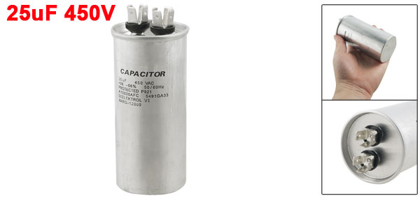 Product Name Motor Capacitor Housing Material Metal Dielectric Material Metallized Polypropylene Film Capacitance 25uF Rated Voltage 450VAC Frequency 50/60Hz Body Dimension 4.4 x 10cm/1.7" x 3.9"(D * H) Color Silver Tone Weight 159g Package Content 1 x Motor Capacitor - Reviews