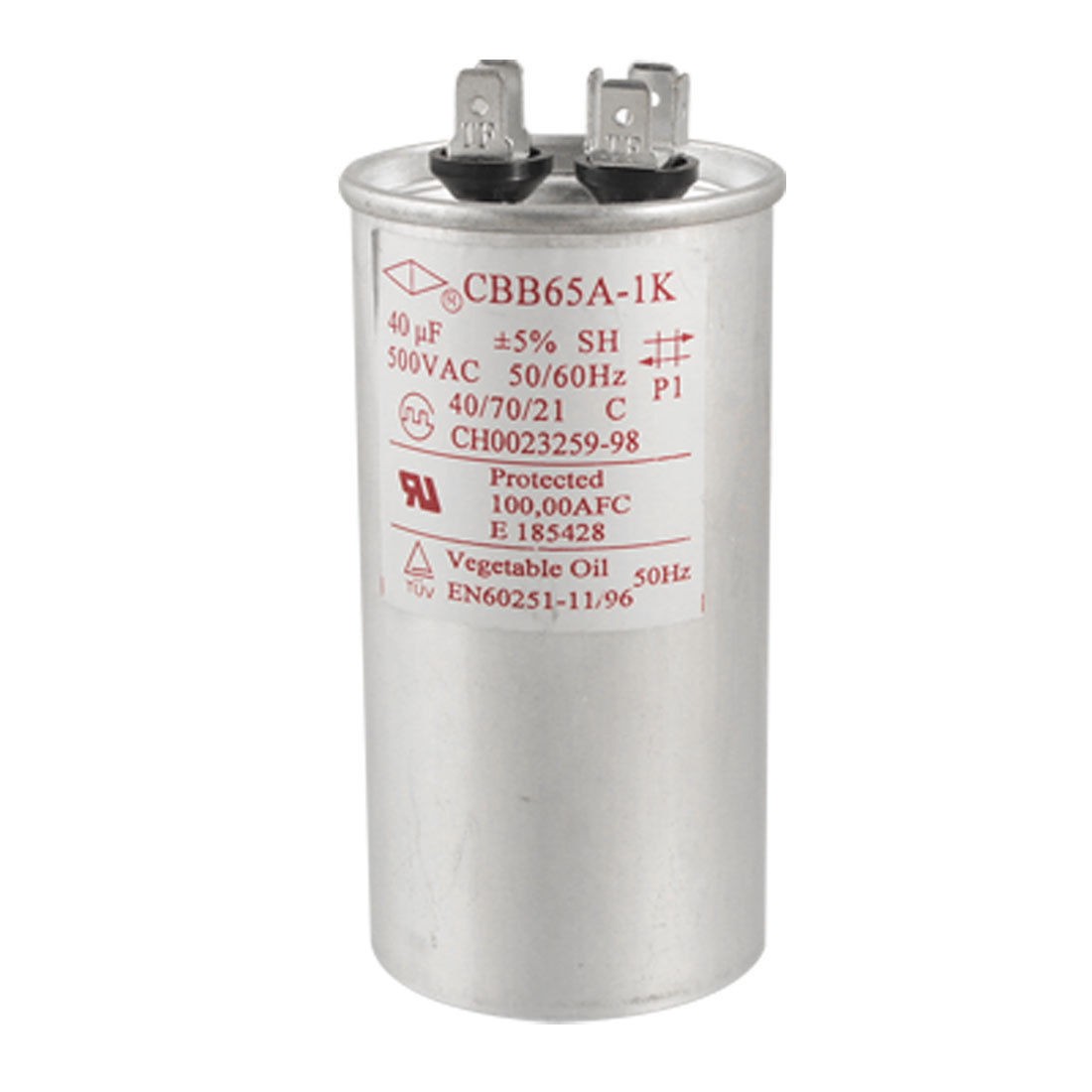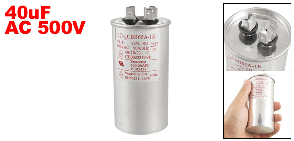 Product Name Motor Capacitor Housing Material Metal Dielectric Material Metallized Polypropylene Film Model CBB65A-1K Capacitance 40uF Tolerance ±5% Rated Voltage 500V AC Frequency 50/60Hz Body Dimension 4.9 x 9.9cm/1.9" x 3.9"(D * H) Operating Temperature 40/70/21 Color Silver Tone Net Weight 175g Package Content 1 x Motor Capacitor - Reviews