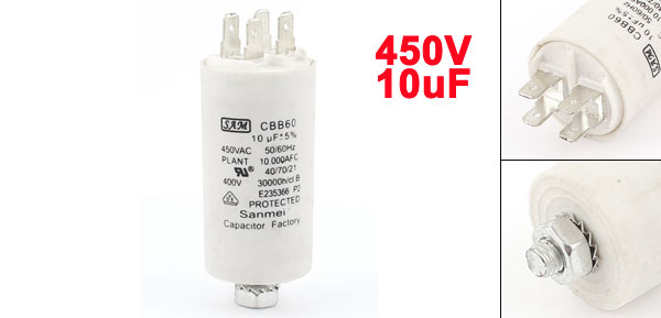 Product Name Motor Capacitor Model CBB60 Dielectric Material Polypropylene Film Housing Material Plastic Capacitance 10µF Voltage AC 450V Frequency 50/60Hz Tolerance +/-5% Rated Voltage/Operation Class AC 400V 30000h/cl.B