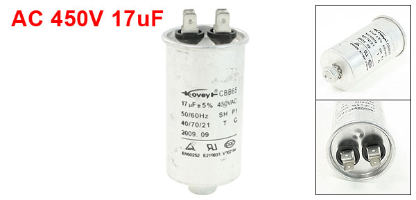 Product Name Motor Capacitor Housing Material Metal Dielectric Material Metallized Polypropylene Film Model CBB65 Capacitance 17uF Tolerance ±5% Rated Voltage 450VAC Frequency 50/60Hz Body Size 4 x 7.5cm/1.6" x 3"(D*H) Screw Thread Diameter 8mm/0.3" Operating Temperature 40/70/21 Color Silver Tone Net Weight 111g Package Content 1 x Motor Capacitor - Reviews