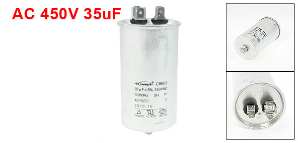 Product Name Motor Capacitor Housing Material Metal Dielectric Material Metallized Polypropylene Film Model CBB65 Capacitance 35uF Tolerance ±5% Rated Voltage 450VAC Frequency 50/60Hz Body Size 5 x 9.1cm/2" x 3.6"(D*H) Screw Thread Diameter 8mm/0.3" Operating Temperature 40/70/21 Color Silver Tone Net Weight 188g Package Content 1 x Motor Capacitor - Reviews