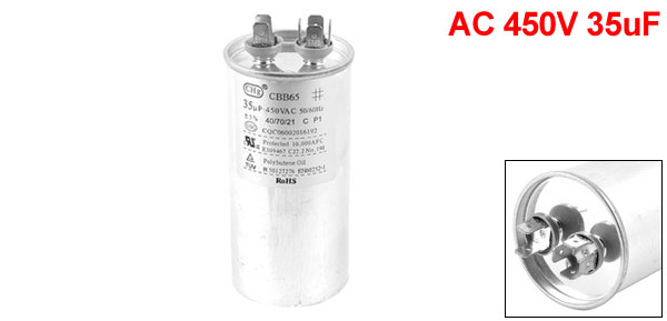 DetailsAir Conditioner AC 450V 35uF Polypropylene Film Motor Capacitor CBB65  Product Name Motor Capacitor Material Polypropylene Model CBB65 Capacitance 35uF Rated Voltage AC 450V Tolerance ±5% Frequency 50/ 60Hz Operating Temperature 40/70/21 Body Dimension 10.3 x 5.02cm/ 4" x 2"(H*D) Total Length 11.6cm/ 4.56" Color Silver Tone Weight 206g Package Content 1 x Motor Capacitor