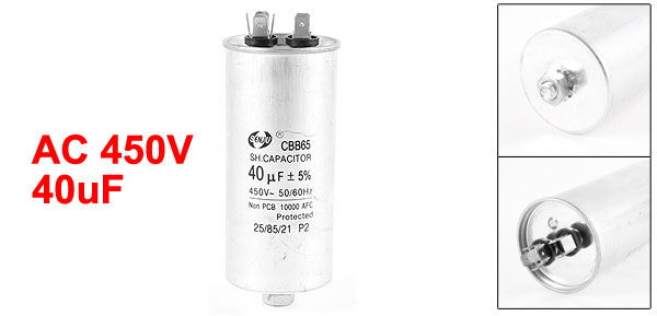 Product Name Motor Capacitor Housing Material Metal Dielectric Material Metallized Polypropylene Film Model CBB65 Capacitance 40uF Tolerance ±5% Rated Voltage 450VAC Frequency 50/60Hz Body Size 11 x 5cm / 4.3" x 2" (D*H) Screw Thread Diameter 8mm / 0.3" Operating Temperature 25/85/21 Color Silver Tone Net Weight 230g Package Content 1 x Motor Capacitor - Reviews