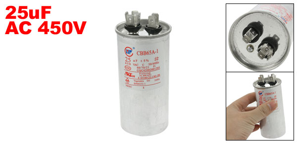 Product Name Motor Capacitor Model No. CBB65A-1 Dielectric Material Metallized Polypropylene Film Housing Material Metal Capacitance 25uF Tolerance ±5% Rated Voltage 450V AC Frequency 50/60Hz Body Dimension 4.5 x 9.5cm/ 1.8" x 3.7" (D * H) Operating Temperature 40/70/21 Color Silver Tone Weight 156g Package Content 1 x Motor Capacitor - Reviews