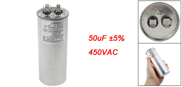Product Name Motor Capacitor Housing Material Metal Dielectric Material Metallized Polypropylene Film Model CBB65A-1 Capacitance 50uF Tolerance ±5% Rated Voltage 450VAC Frequency 50/60Hz Body Dimension 5 x 13cm/1.9" x 5"(D * H) Operating Temperature 40/70/21 Color Silver Tone Net Weight 264g Package Content 1 x Motor Capacitor - Reviews