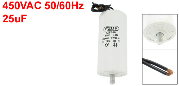 Product Name Motor Capacitor Housing Material Plastic Dielectric Material Aluminum Electrolytic Model CBB60 Capacitance 25uF Tolerance +/-5% Rated Voltage 450VAC Frequency 50/60Hz Body Size 4.8 x 9.8cm/1.9" x 3.9"(D * H) Color White, Black Weight 129g Package Content 1 x Motor Capacitor - Reviews