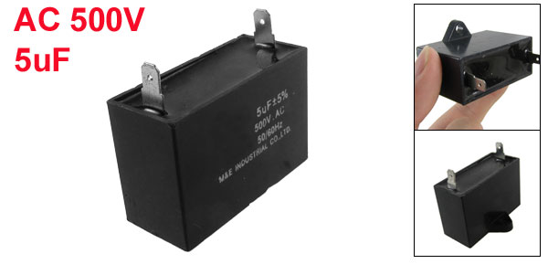 Product Name Motor Capacitor Housing Material Plastic Dielectric Material Polypropylene Film Capacitance 5uF Tolerance 5% Rated Voltage 500VAC Frequency 50/60Hz Body Size 4.7 x 2 x 3.1cm/1.9'' x 0.8'' x 1.2'' (L * W * T) Pin Distamce 3.85cm/1.5'' Color Black Weight 32g Package Content 1 x Motor Capacitor - Reviews
