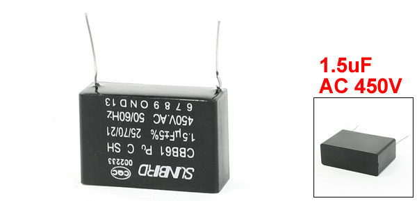 DetailsAir Conditioner Motor Run Capacitor 1.5uF 5% AC 450V 50/60 Hz  Product Name Capacitor Model CBB61 Type Polypropylene Film Capacitor Material(External) Plastic Rated Capacitance 1.5uF Tolerance +/-5% Rated Frequency 50/60Hz Rated Voltage 450V.AC Size 3.5 x1.4 x 2.5cm/1.38" x 0.55" x 0.98"(L*W*T) Pin Length 1.7cm/0.67" Distance between Pins 3cm/0.18" Main Color Black Weight 17g Package Content 1 x Capacitor