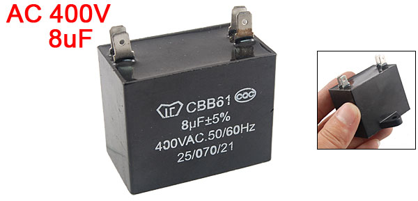 Product Name Motor Capacitor Model CBB61 External Material Plastic Dielectric Material Metalized Polypropylene Rated Capacitance 8uF Tolerance ±5% Rated Frequency 50/60Hz Rated Voltage AC 400V Size 5 x 4 x 3cm/ 2" x 1.6" x 1.2" (L*W*T) Hole Dia. 4.5mm/ 0.18" Weight 62g Package Content 1 x Motor Run Capacitor - Reviews