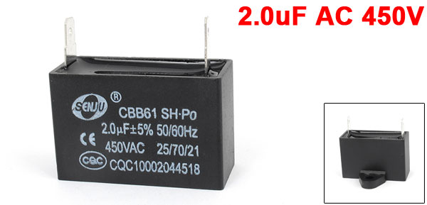 Product Name Motor Run Capacitor Model CBB61 Color Black External Material Plastic Dielectric Material Polypropylene Film Rated Capacitance 2.0uF Tolerance ±5% Rated Frequency 50/60Hz Rated Voltage AC 450V Body Size 38 x 26 x 15mm/ 1.5" x 1" x 0.6"(L*W*T) Fixing Hole Diameter 5mm/0.2" Net Weight 21g Package Content 1 x Motor Run Capacitor - Reviews