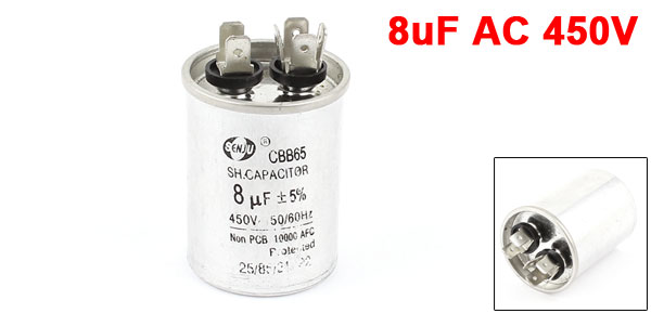 Product Name Motor Start Capacitor Model CBB65 Dielectric Material Polypropylene Film Rated Capacitance 8uF Tolerance ±5% Rated Voltage AC 450V Frequency 50/60Hz Operating Temperature 25/85/24 Size 55 x 40mm/ 2.2" x 1.6" (H*D) Main Color Silver Tone Net Weight 86g Package Content 1 x Motor Start Capacitor  - Reviews