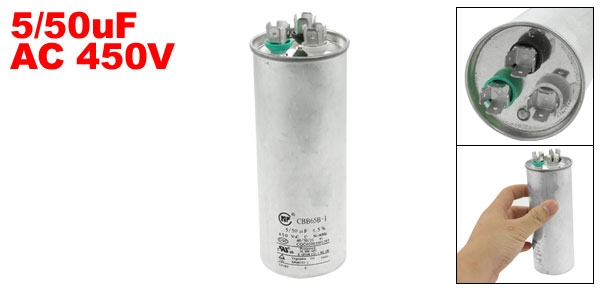 DetailsAir Conditioner Polypropylene Film 5/50uF AC 450V 50/60Hz Motor Capacitor  Product Name Motor Capacitor Model No. CBB65B-1 Dielectric Material Metallized Polypropylene Film Housing Material Metal Capacitance 5/50uF Tolerance 5% Rated Voltage 450V AC Frequency 50/60Hz Body Dimension 5 x 13cm/ 2" x 5.1" (D * H) Operating Temperature 40/70/21 Color Silver Tone Weight 235g Package Content 1 x Motor Capacitor