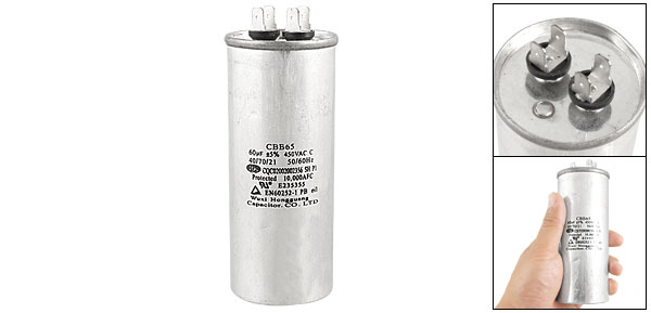 Product Name Motor Capacitor Model No. CBB65 Dielectric Material Metallized Polypropylene Film Housing Material Metal Capacitance 60uF Tolerance ±5% Rated Voltage 450V AC Frequency 50/60Hz Body Dimension 4.9 x 12.4cm / 1.9" x 4.9" (D * H) Operating Temperature 40/70/21 Color Silver Tone Weight 250g Package Content 1 x Motor Capacitor - Reviews