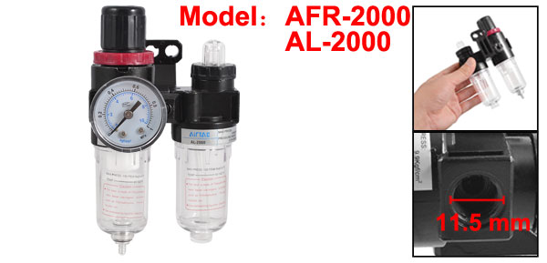 Product Name Air Filter Regulator Lubricator Model AFR-2000, AL-2000 Material Metal, Plastic Working Medium Air Max. Pressure 9.9kgf/cm2 Adjustable Pressure Range 0.5-9.0kgf/cm2 Joint Pipe Bore 1/4" (11.5 mm) Pressure Gauge Range 0-1 MPa, 0-10 kgf/cm2 Total Size 15 x 8.7 x 8.5cm/5.9" x 3.4" x 3.3"(L*W*H) Pressure Gauge Size 4.1 x 3.9cm/1.6" x 1.5"(D*T) Color Black, Clear Weight 290g Package Content 1 x Air Source Treatment
