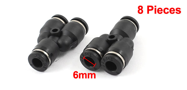 DetailsAir Piping 3 Ways 6mm to 6mm Y Shaped Coupler Tube Quick Joint Fittings 8 Pcs  Product Name Quick Fitting Design Y Shaped , 3 Ways Connector Type 6mm to 6mm/0.24" to 0.24" Material Plastic Size (Approx) 39 x 25 x 13.5mm / 1.54" x 1" x 0.53" (L*W*H) Color Black, Silver Tone Weight 64g Package Content 8 x Pneumatic Quick Fittings