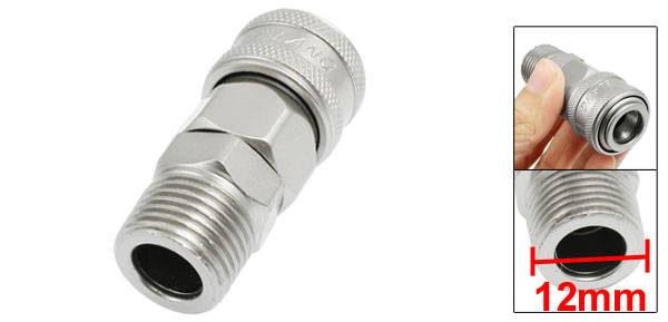 Product Name Quick Coupler Male Thread Size 20 x 13mm/0.8" x 0.5"(D*L) Fit Tube Outside Dia. 12mm/0.5" Overall Size 59 x 27mm/2.3" x 1.1" (L*Max.D) Color Silver Tone Material Metal Weight 120g Package Content 1 x Quick Coupler - Reviews