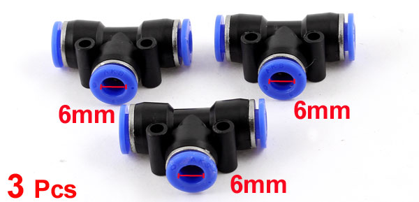 Product Name Pneumatic Quick Fittings Connector Type 6mm to 6mm /3/13" to 3/13"( T-shaped) Material Plastic Dimension (Approx) 3.7 x 2.4 x 1.3cm/ 1.5" x 0.9" x 0.5" (L*W*H) Color Black, Blue Weight 19g Package Content 3 x Pneumatic Quick Fittings - Reviews