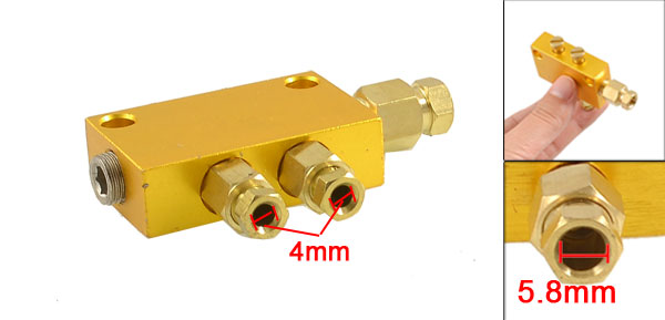 Product Name Adjustable Distributor Type 2 Way Material Brass Color Gold Tone Fit Tube Dia. 4mm/ 0.16"; 6mm/ 0.24" Mounted Hole Dia. 5.8mm/ 0.23" Hole Distance 37mm/1.5" (Center to Center) Dimension 70 x 50 x 13mm/ 2.7" x 2" x 0.51"(L*W*H) Net Weight 77g Package Content 1 x Pneumatic Adjustable Distributor - Reviews
