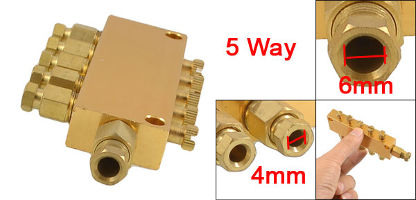 Product Name Adjustable Distributor Type 5 Way Material Brass Color Gold Tone Fit for Tube Inner Dia. 4mm/ 0.16"; 6mm/ 0.24" Mounted Hole Dia. 6mm/ 0.23" Hole Distance 80mm/ 3.1" (Center to Center) Dimension 113 x 53 x 13mm/ 4.4" x 2.1" x 0.51"(L*W*H) Net Weight 148g Package Content 1 x Pneumatic Adjustable Distributor - Reviews