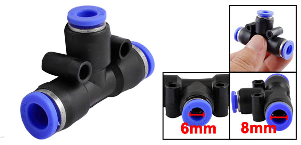 Product Name Pneumatic Quick Fitting Design T Shaped, 3 Ways Connector Type 8mm to 6mm Material Plastic Size (Approx) 51 x 32 x 15mm / 2" x 1.3" x 0.59" (L*W*H) Color Black, Blue Weight 8g Package Content 1 x Pneumatic Quick Fitting - Reviews