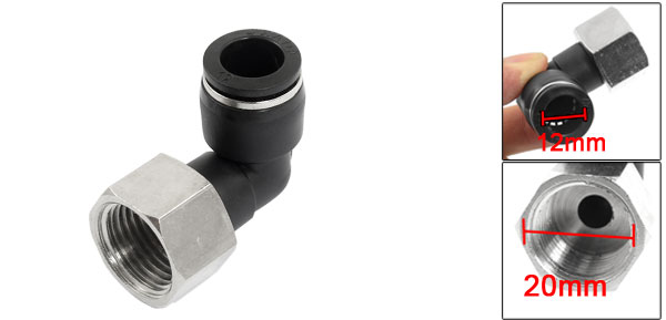 Product Name Quick Fitting Model JPLF12-04 Design L Shaped (90 Degree Elbow) Material Plastic, Metal Thread Size 1/2" PT Thread Diameter 20mm Tube Diameter 12mm Total Size (Approx) 44 x 37 x 27mm/ 1.7" x 1.5" x 1.1" (L*W*H) Color Black Weight 45g Package Content 1 x Quick Fitting - Reviews