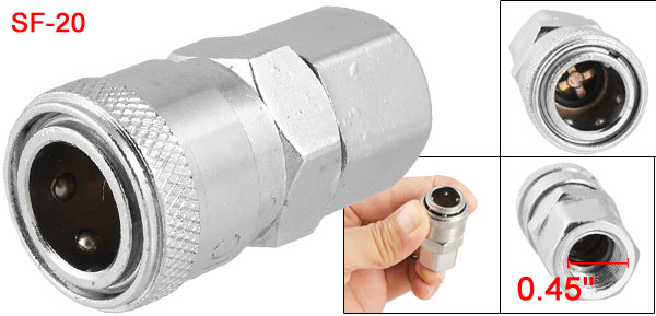 Product Name Quick Coupler Type SF-20 Fluid Applied Air Thread Inner Dia. 11.5mm/ 0.45" Overall Size 43 x 23mm/ 1.7" x 0.9" (L*D) Color Silver Tone Material Metal Weight 55g Package 1 x Quick Coupler - Reviews