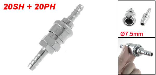 Product Name Quick Coupler Set Type 20SH + 20PH Fit Hose Diameter 7.5mm/0.29" Fluid Applied Air Hose Tail Inner Diameter 4.5mm/ 0.18" Overall Size 94 x 25mm/ 3.7" x 1" (L*max.D) Hose Tail Length 26mm/ 1.02" Color Silver Tone Material Metal Weight 89g Package 1 x Quick Coupler Set - Reviews