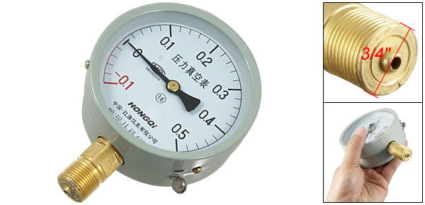 Product Name Compound Gauge Pressure Intensity -0.1-0.5Mpa Accuracy Class 1.6 (+/-1.6% fsd) Connector Type 3/4"(1.9cm) Threaded Male NPT Size 9.7 x 4.5cm/ 3.8" x 1.8" (D*T) Dial Color White Exterior Material Metal Net Weight 354g Package 1 x Compound Gauge - Reviews