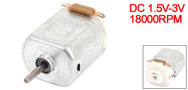 Product Name Micro Motor Model NO. 130 Rated Voltage DC 1.5V-3V Rated Current 0.2A Speed 18000RPM Body Size 27 x 20 x 15mm / 1.06" x 0.78" x 0.59"(L*W*T) Shaft Dia. 2mm/ 0.079" Total Length 38mm / 1.5" Main Color Silver Tone Material Metal Weight 17g Package 1 x Micro Motor - Reviews