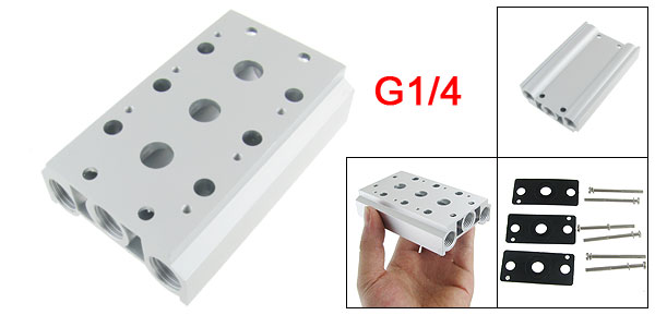 Product Name Solenoid Valve Base Model No. 200M-3F Stations 3 Nominal Bore 10mm / 0.39" Tube Hole G1/4 Mounting Hole Diameter 4.5mm / 0.177" Dimension(Approx.) 92 x 59.2 x 22mm / 3.6" x 2.3" x 0.86" (L*W*T) Material Aluminum Color Silver Tone Weight 140g Package Content 1 x Solenoid Valve Base