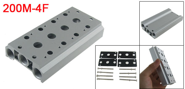 Product Name Solenoid Valve Base Model No. 200M-4F Stations 4 Nominal Bore 10mm / 0.39" Tube Hole G1/4 Mounting Hole Diameter 4.5mm / 0.177" Dimension(Approx.) 115 x 59.2 x 22mm / 4.5" x 2.3" x 0.86" (L*W*T) Material Aluminum Color Silver Tone Weight 176g Package Content 1 x Solenoid Valve Base