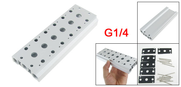 Product Name Solenoid Valve Base Model No. 200M-6F Stations 6 Nominal Bore 10mm / 0.39" Tube Hole G1/4 Mounting Hole Diameter 4.5mm / 0.177" Dimension(Approx.) 160.5 x 59.2 x 22mm / 6.3" x 2.3" x 0.86" (L*W*T) Material Aluminum Color Silver Tone Weight 250g Package Content 1 x Solenoid Valve Base