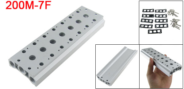 DetailsAluminum 7 Row Stations Manifold Solenoid Air Pilot Valve Base  Product Name Solenoid Valve Base Model No. 200M-7F Stations 7 Nominal Bore 10mm / 0.39" Tube Hole G1/4 Mounting Hole Diameter 4.5mm / 0.177" Dimension(Approx.) 184 x 59.2 x 22mm / 7.2" x 2.3" x 0.86" (L*W*T) Material Aluminum Color Silver Tone Weight 276g Package Content 1 x Solenoid Valve Base
