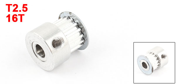Product Name Timing Pulley Fit Timing Belt Model T2.5 Number of Tooth 16T Pitch 2.5mm/ 0.1" Bore Diameter 5mm/0.2" Flange 2 Sides Belt Width 6mm/ 0.24" Overall Size 15 x 16mm/ 0.59" x 0.63"(D*H) Material Aluminum Alloy Color Silver Tone Weight 6g Package Content 1 x Timing Pulley - Reviews