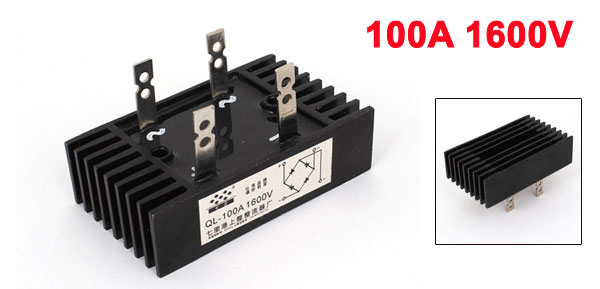 Product Name Bridge Rectifier Model AQL-100A 1600V Output Current(DC) 100A Repetitive Peak Reverse Voltage(AC) 1600V Pins 4 Fixing Hole Diameter 6mm / 0.24" Fixing Holes Spacing 52mm / 2" Main Body Size 10 x 6 x 2.8cm / 4" x 2.4" x 1.1" (L*W*T) Pin Length 25mm / 1" Material Aluminum, Metal Color Black, Silver Tone Net Weight 240g Package Content 1 x Bridge Rectifier - Reviews