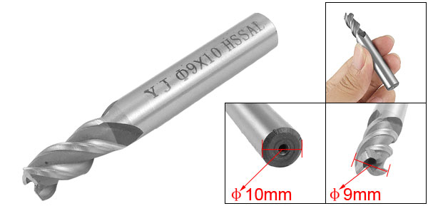 Product Name 3 Flute End Mill Material HSS Color Gray Cutting Diameter 9mm/ 1/8“'' Cutting Depth 25mm/ '' Shank Dia. 10mm/ 7/16“'' Total Length 68mm/ 2 5/8'' Weight 34g