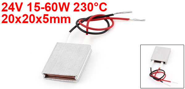DetailsAluminum PTC Heater Thermostat Constant Temperature 25x20x5mm 24V 230C  Product Name PTC Heater Material Aluminum Voltage 24V Power 15-60W Temperature 230 Celsius Size 20x20x5mm / 1" x 0.8" x 0.2"(L*W*T) Weight 8g Package Content 1 x PTC Heater